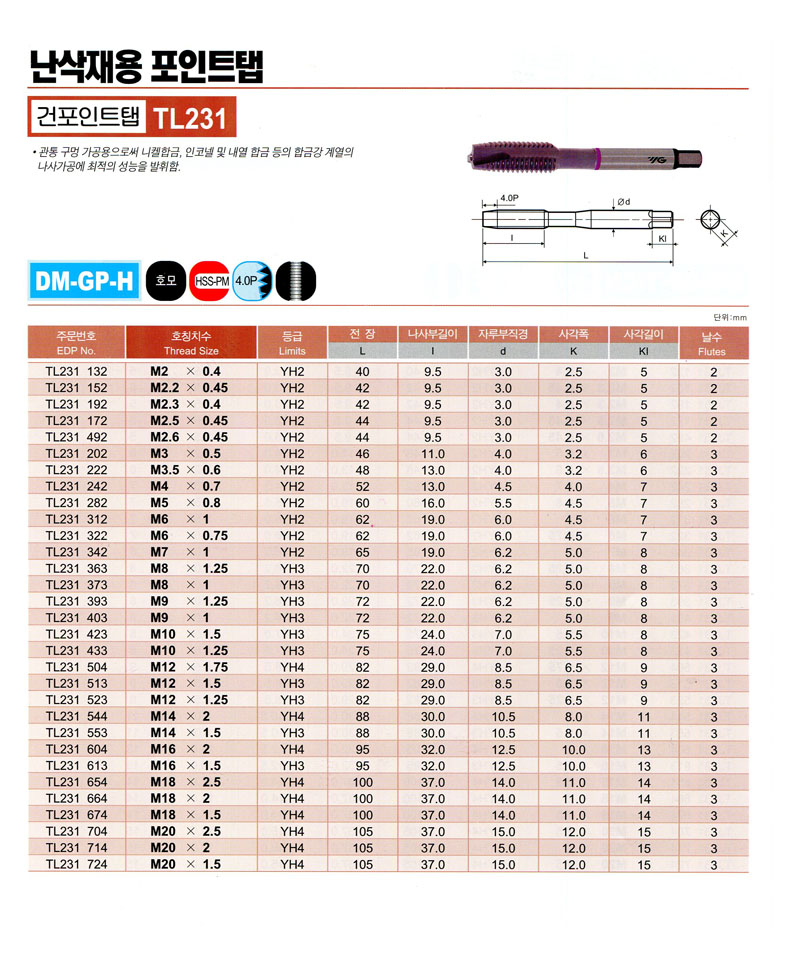 ³­»èÀç¿ë HSS-PM (È£¸ð) TL231 664 (M18 * 2.00) YG-1 36,430¿ø