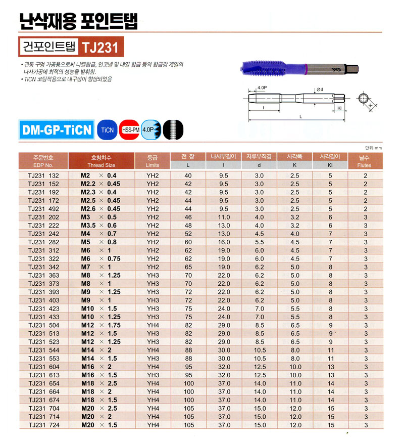 ³­»èÀç¿ë HSS-PM (TICN) TJ231 504 (M12 * 1.75) YG-1 18,880¿ø