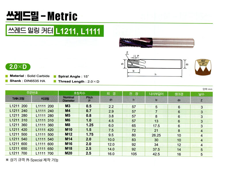 ÃÊ°æ ¾²·¹µå¹Ð(TIALNÄÚÆÃ) 2.0 X D L1111 540 (M14 * 2.00) YG-1 88,840¿ø