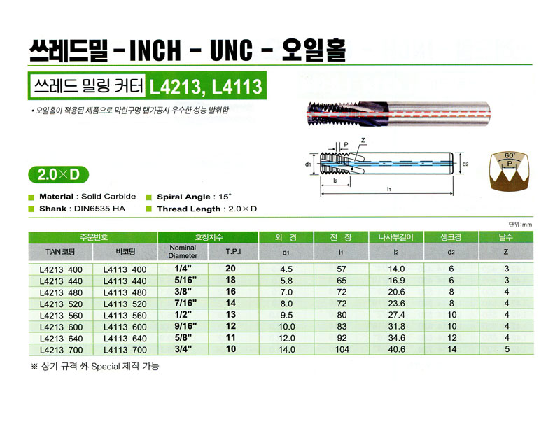 ÃÊ°æ ¾²·¹µå¹Ð-INCH-UNC-¿ÀÀÏȦ(TIALNÄÚÆÃ) L4113 600 (9/16" * 12) YG-1 124,800¿ø