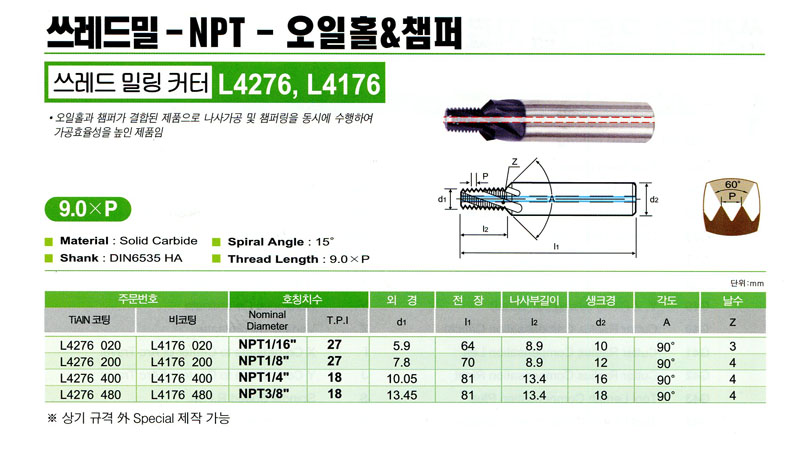 ÃÊ°æ ¾²·¹µå¹Ð-NPT-¿ÀÀÏȦ&èÆÛ(TIALNÄÚÆÃ) L4276 020 (NPT 1/16" * 27) YG-1 118,950¿ø