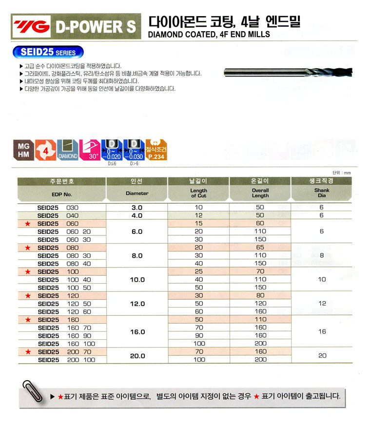 D-POWER S ´ÙÀ̾Ƹóµå ÄÚÆÃ, 4³¯ ¿£µå¹Ð SEID25 060 20 (6.0*20*110L) YG-1 50,400¿ø