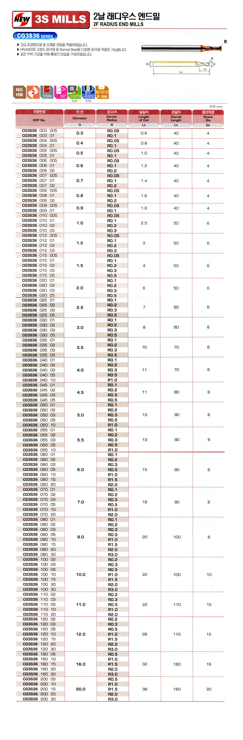3S MILLS 2³¯ ·¡µð¿ì½º ¿£µå¹Ð CG3S36 020 03 (2.0*R0.3*6.0*50L) NEW CENTURY 12,960¿ø