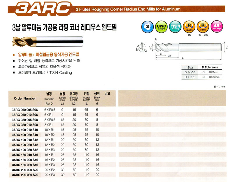 3³¯ ¾Ë·ç¹Ì´½ °¡°ø¿ë ¶óÇÎ Äڳʷ¹µð¿ì½º ¿£µå¹Ð 3ARC 060 005 S06 (6.0*R0.5*9.0*15*65L) 24,550¿øºÎÅÍ~ ÀåÁø°ø±¸ 24,550¿ø   EA