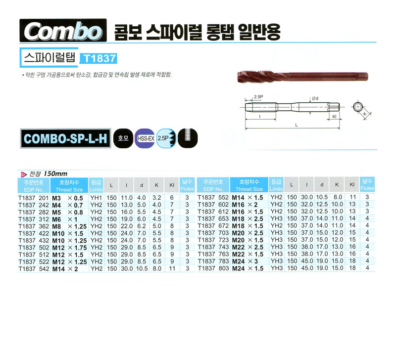 ÀϹݿë HSS-EX (È£¸ð - ÀüÀå150mm) T1837 653 (M18 * 2.50) YG-1 40,090¿ø