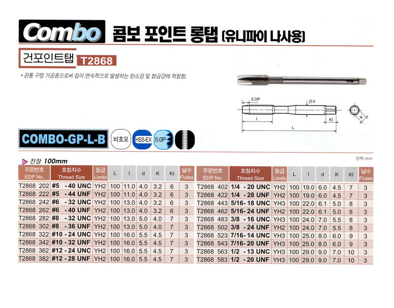 À¯´ÏÆÄÀÌ ³ª»ç¿ë HSS-EX (ºñÈ£¸ð - ÀüÀå100mm) T2868 222 (#5 - 44 UNF) YG-1 12,250¿ø