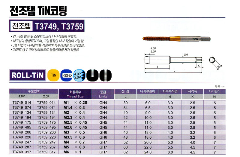 ÀüÁ¶ÅÇ °­¿ë (TIN ÄÚÆÃ) T3749 247 (M4.0 * 0.70) YG-1 7,650¿ø