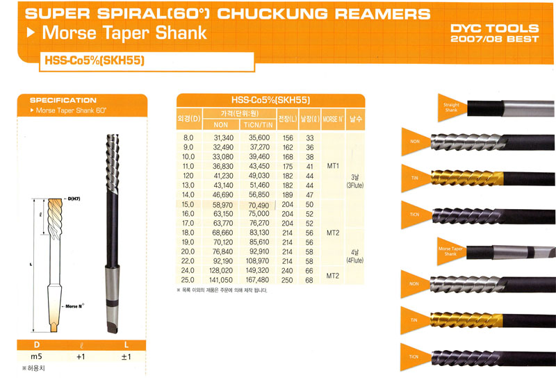 HSS Ç츮Į¸®¸Ó(60¢ª)-¸ð¿À½º Å×ÀÌÆÛ ¼§Å© 17.0*52*204L TICN/TIN DYC 93,800¿ø