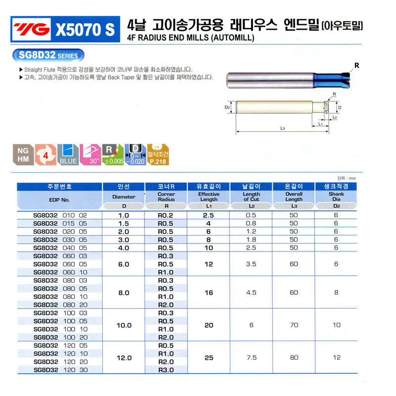 X5070 S 4³¯ °íÀ̼۰¡°ø¿ë ·¡µð¿ì½º ¿£µå¹Ð(¾Æ¿ìÅä¹Ð) SG8D32 060 05 (6.0*R0.5*12*3.5*60L) YG-1 29,520¿ø
