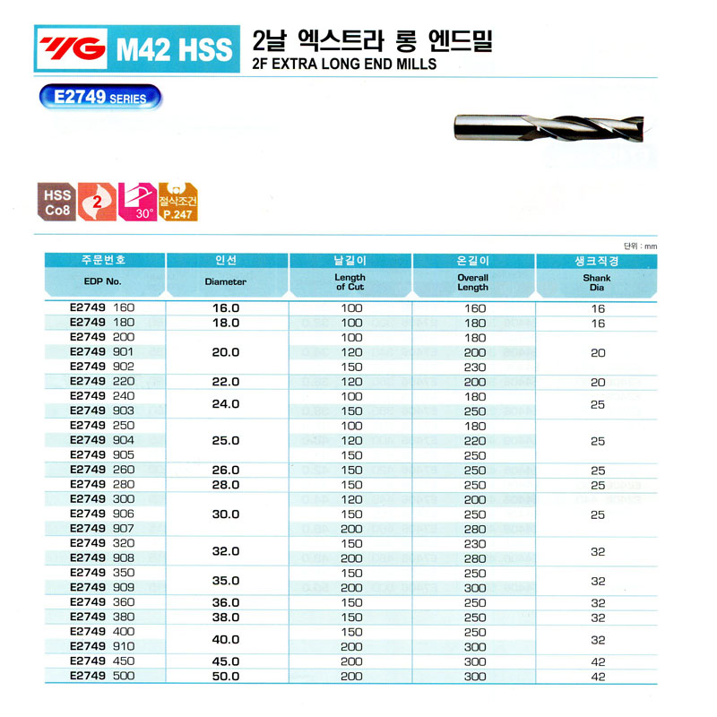 M42 HSS 2³¯ ¿¢½ºÆ®¶ó ·Õ ¿£µå¹Ð E2749 280 (28.0*150*250L) YG-1 88,890¿ø   EA