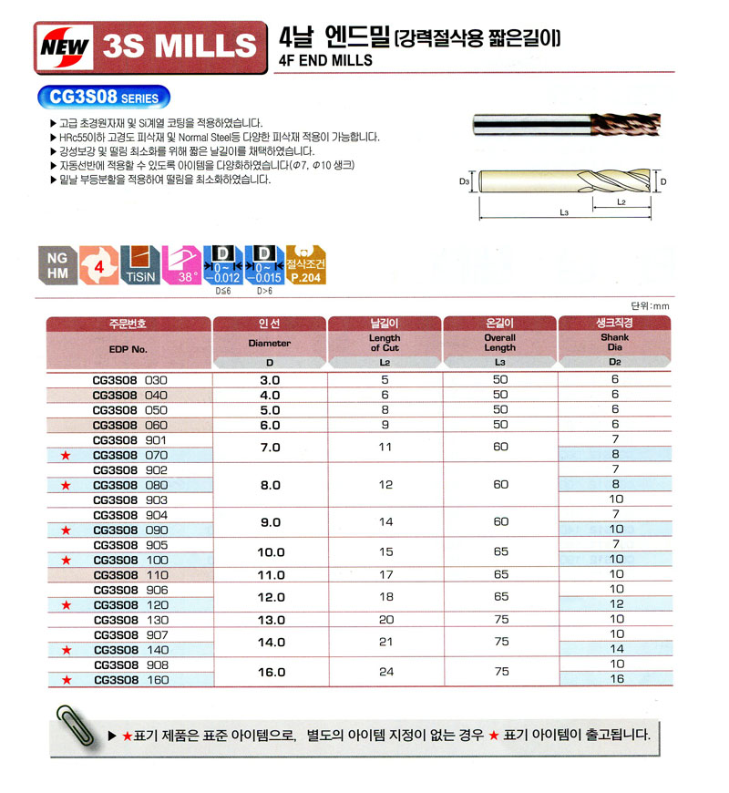 3S MILLS 4³¯ ¿£µå¹Ð(°­·ÂÀý»è¿ë ªÀº±æÀÌ) CG3S08 060 (6.0*9.0*50L) NEW CENTURY 12,960¿ø
