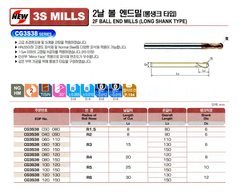 3S MILLS 2³¯ º¼ ¿£µå¹Ð(·Õ»ýÅ© ŸÀÔ) CG3S38 060 150 (R3.0*15*150L) NEW CENTURY 26,640¿ø