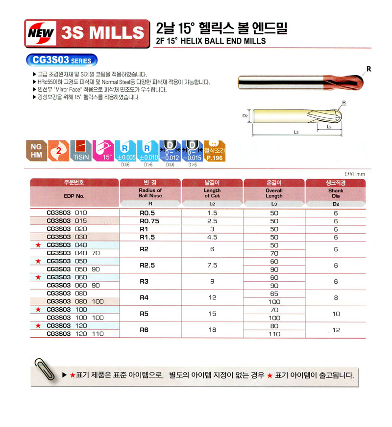 3S MILLS 2³¯ 15¢ª Ç︯½º º¼ ¿£µå¹Ð CG3S03 040 (R2.0*6.0*50L) NEW CENTURY 15,120¿ø