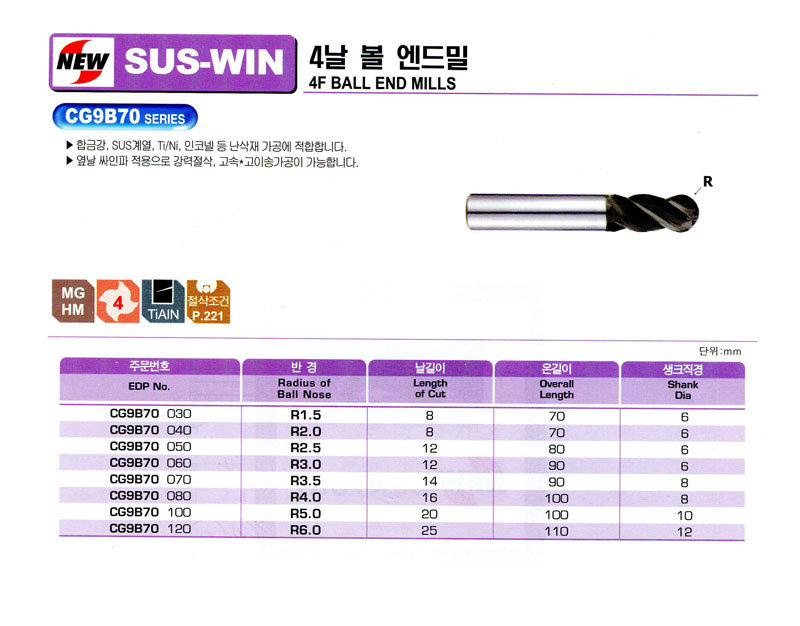 SUS-WIN 4³¯ º¼ ¿£µå¹Ð CG9B70 030 (R1.5*8.0*70L) NEW CENTURY 22,000¿ø