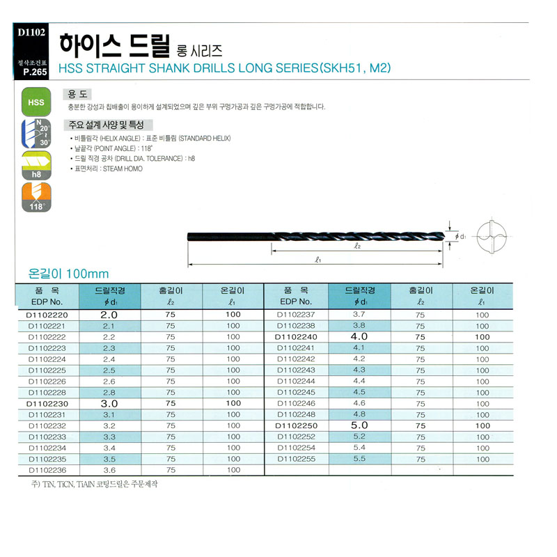 ÇÏÀ̽º ·Õ µå¸± - ÀüÀå100mm D1102250 (5.0*75*100L) YG-1 1,960¿ø   EA